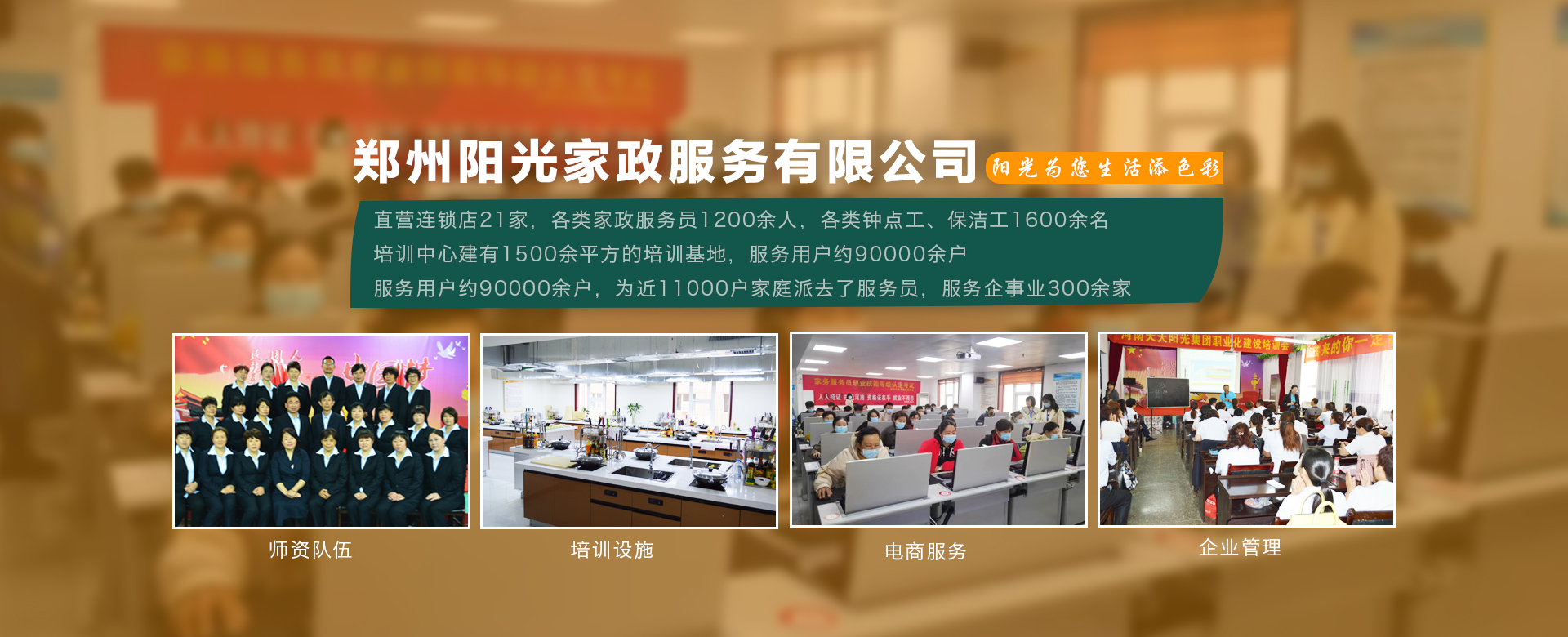 鄭州陽光家政服務(wù)有限公司成立于1998年,是鄭州市第 一家經(jīng)工商登記的家政服務(wù)企業(yè),是以家政服務(wù)、家政培訓(xùn)、社區(qū)服務(wù)、社區(qū)養(yǎng)老、托幼護(hù)理、清洗保潔為一體的社區(qū)生活服務(wù)集成商。公司有直營連鎖店21家,各類家政服務(wù)員1200余人,各類鐘點工、保潔工1600余名。鄭州陽光家政商學(xué)院建有1500余平方的培訓(xùn)基地,···